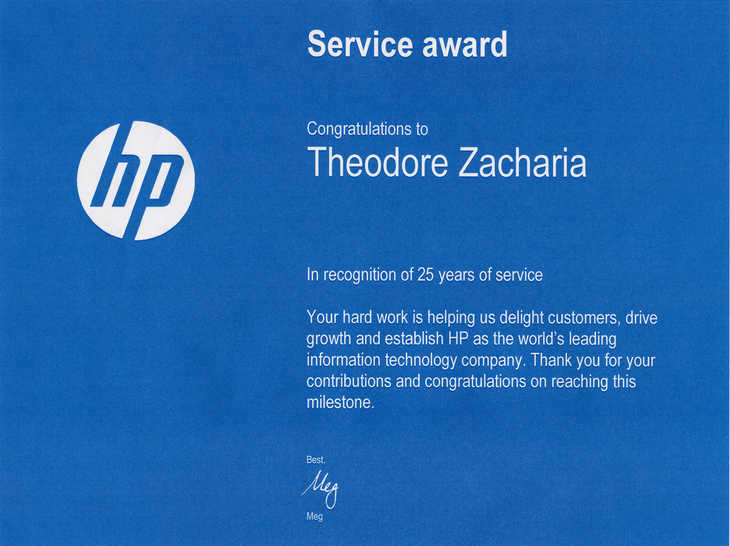 I reached 25 years of service at EDS/HP and was rewarded with this very nice printed certificate in an envelope