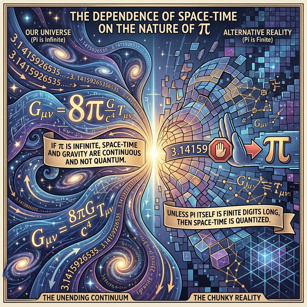 General Relativity won't neatly tie into Quantum, Quantum is missing something if we can't describe everything so... The single most present thing in both, from my perspective, even though it is unexpected in Quantum is π. As pi, which is irrational and transendental, is in all equations for space-time and gravity, space and time should be continuous and thus not quantum in nature, unless pi itself is finite digits long, even if a trillion digits long, any limit is therefore the resolution of the Universe, in which case the Universe is indeed quantum. So which is it? |